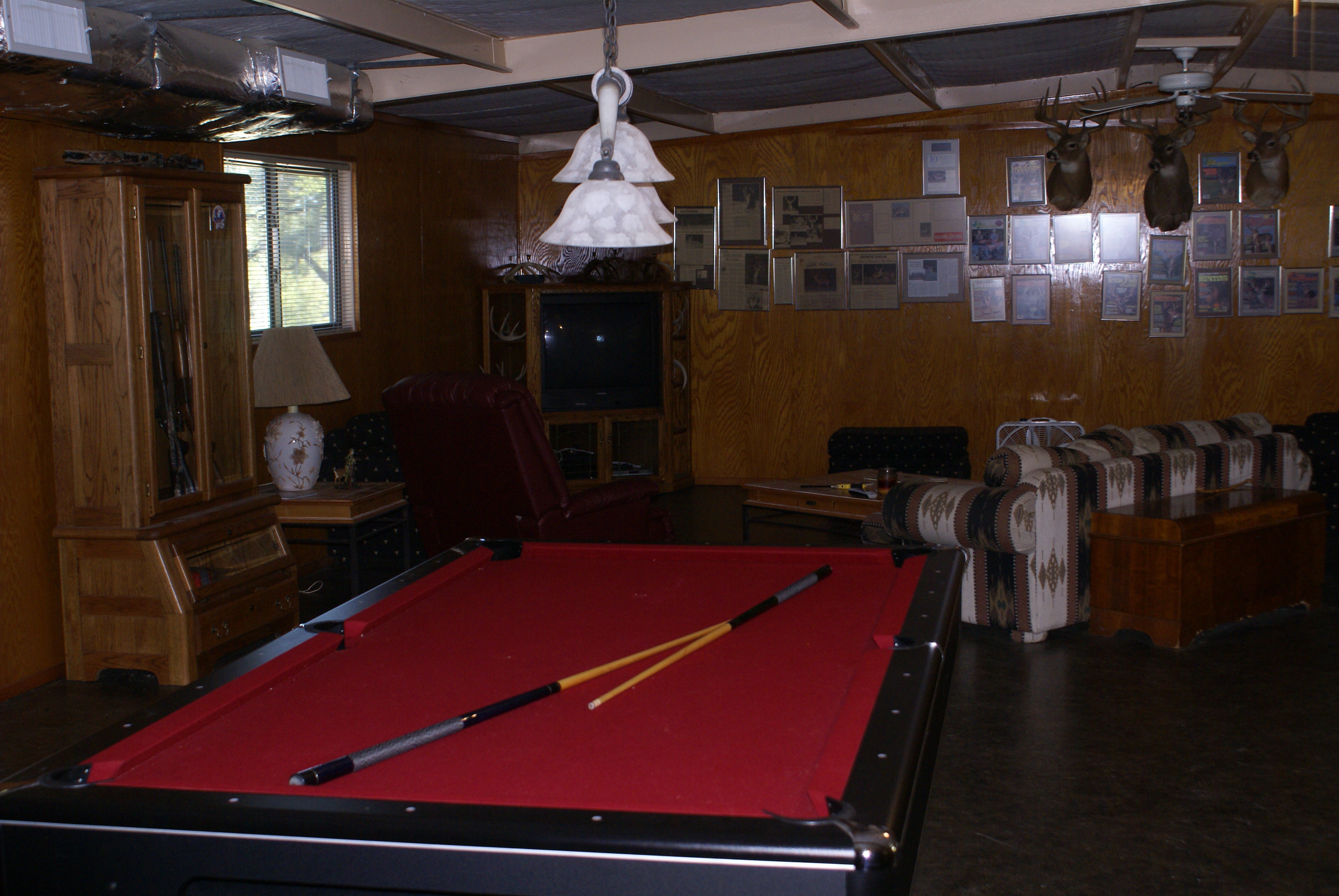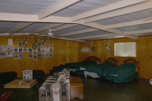 There is a 1500 square foot hunting lodge for those hunters that wish to stay on the ranch. It is furnished with a kitchen, comfortable furniture, beds, air conditioning, bathroom with shower, satellite television, and a pool table. There is also a hotel and several restaurants in Clifton and a bar & grills in Cranfills Gap and Meridian that have live music on many Saturday nights.